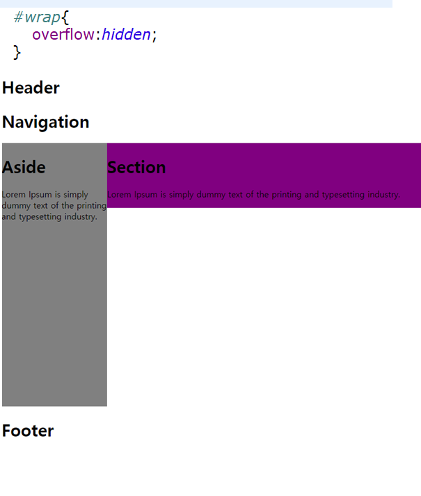 자손에 float 속성을 적용하면 부모의 overflow 속성에 hidden 키워드를 적용합니다.