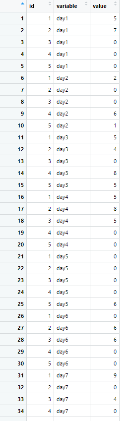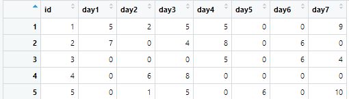 colnames(wide) <- c('id','day1','day2','day3','day4','day5','day6','day7')