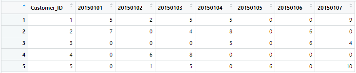 wide <- dcast(data, Customer_ID ~ Date, sum)