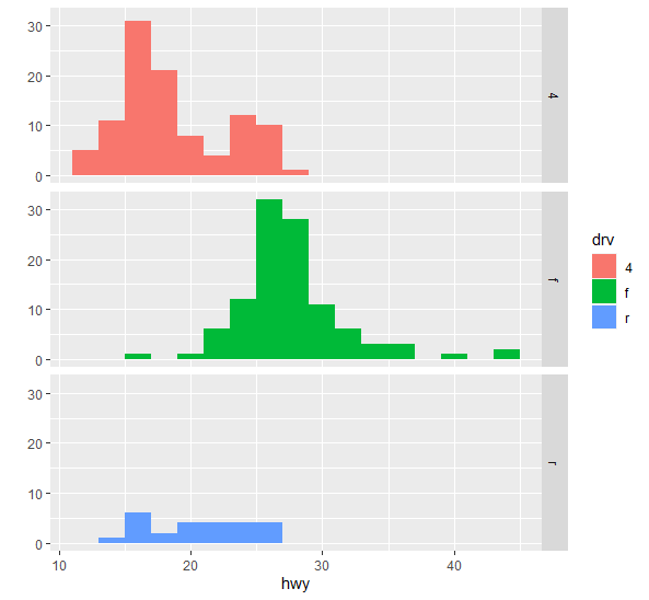 qplot(hwy, data = mpg, fill = drv, facets = drv~. , binwidth=2)