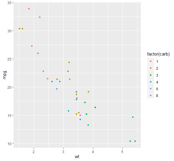 qplot(wt,mpg, data=mtcars, color=factor(carb), geom = "point")