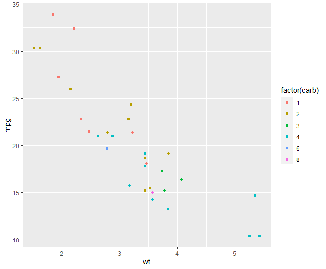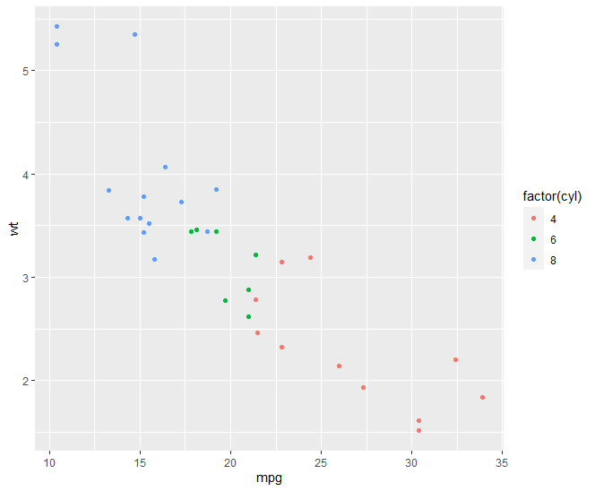 p <- ggplot(mtcars, aes(mpg,wt,color=factor(cyl)))