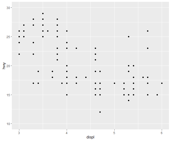 ggplot(data=mpg, aes(x=displ, y=hwy)) + geom_point()