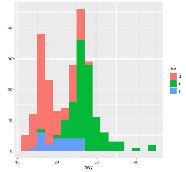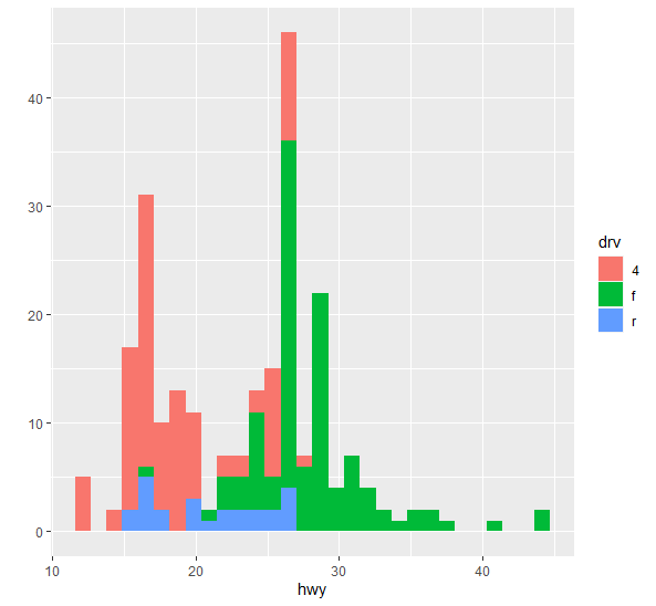 qplot(hwy, data=mpg, fill=drv) # fill 옵션 적용