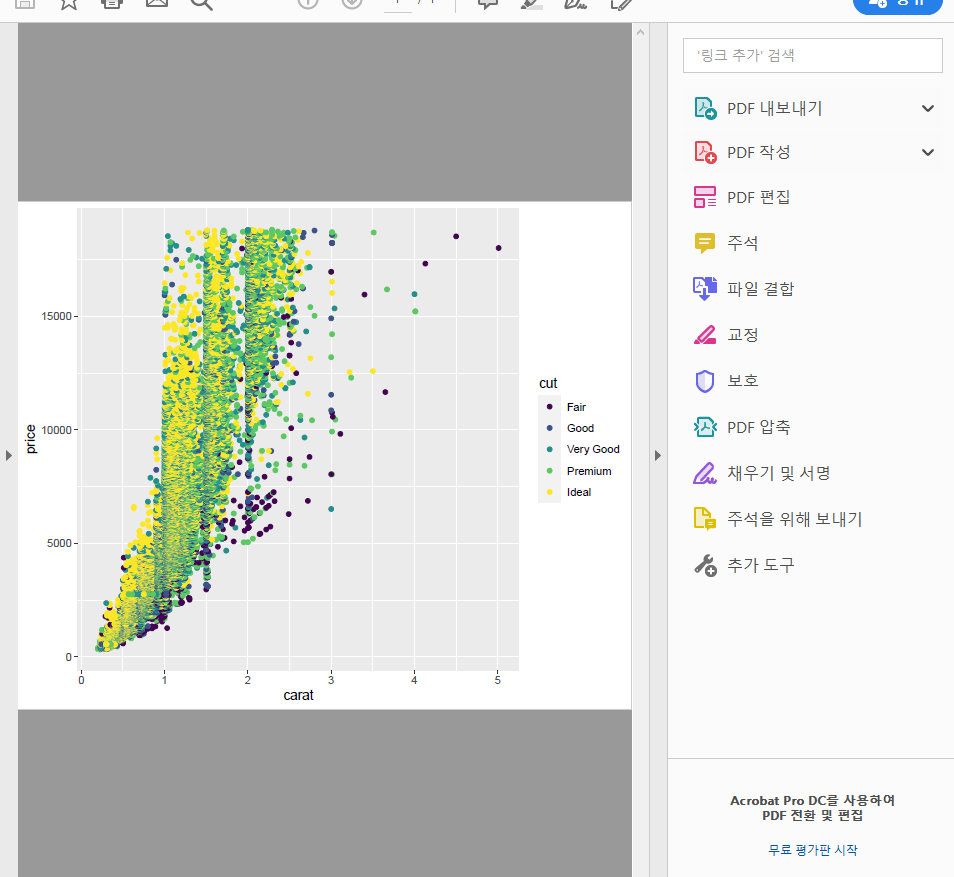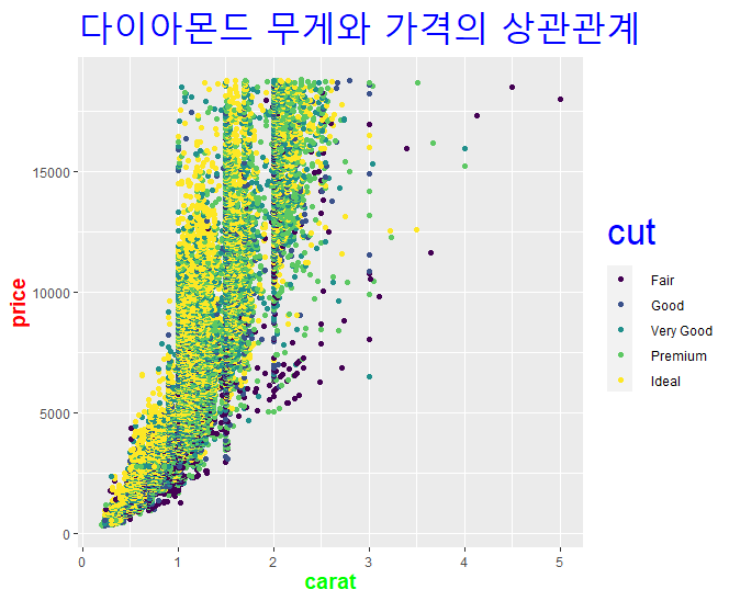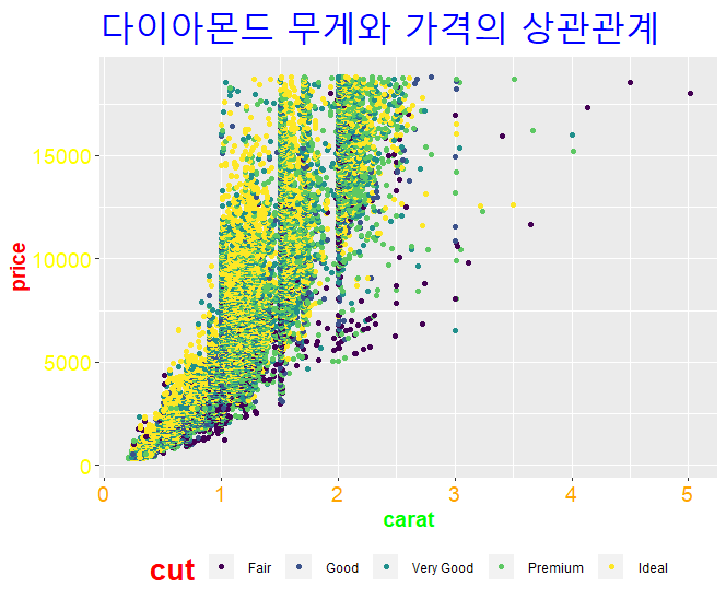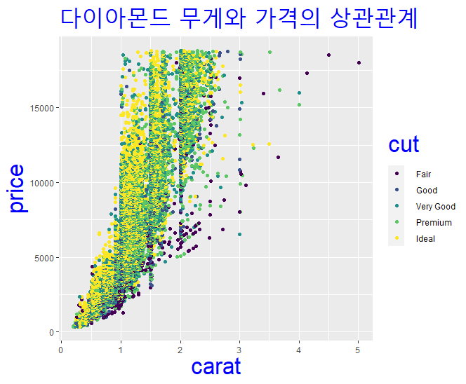 p <- ggplot(diamonds, aes(carat,price,color=cut)) # (x= , y=) 생략 가능