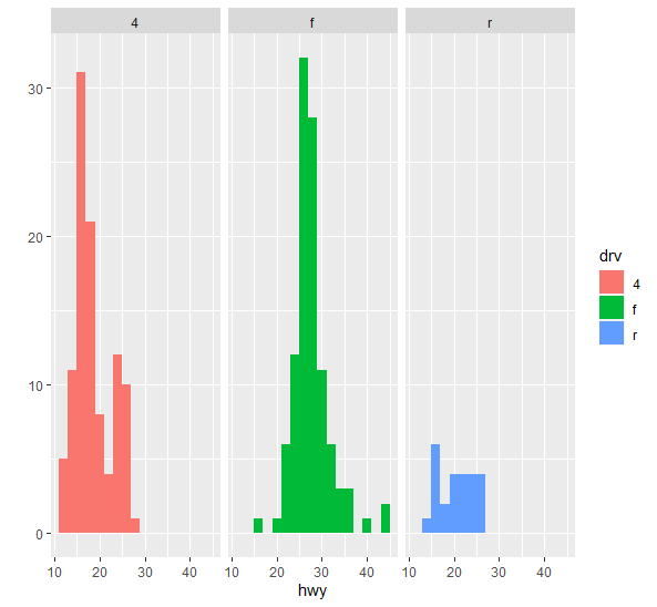 qplot(hwy, data = mpg, fill = drv, facets = .~drv , binwidth=2)