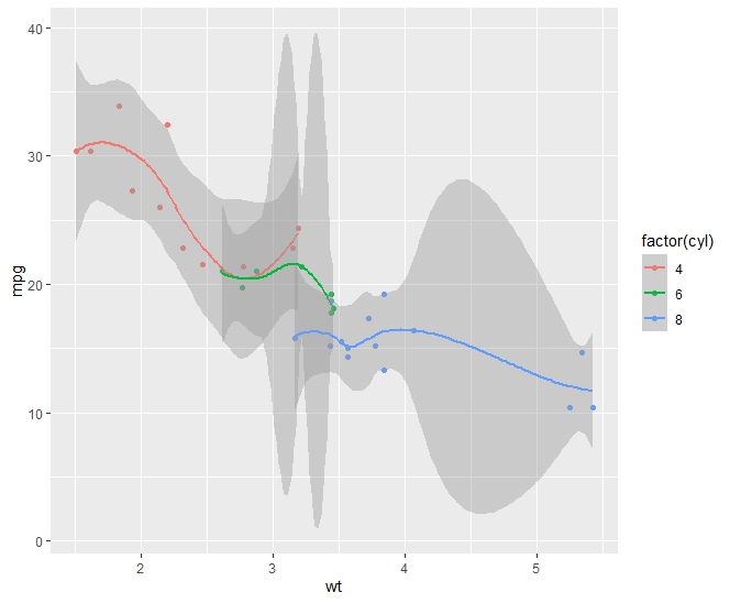 qplot(wt,mpg,data=mtcars,color=factor(cyl), geom = c("point", "smooth"))