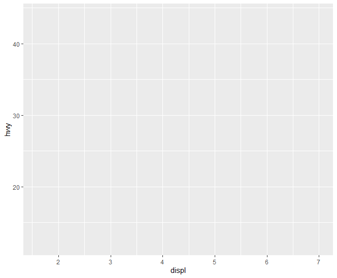 ggplot(data=mpg, aes(x=displ, y=hwy)) #aesthetics(미학)