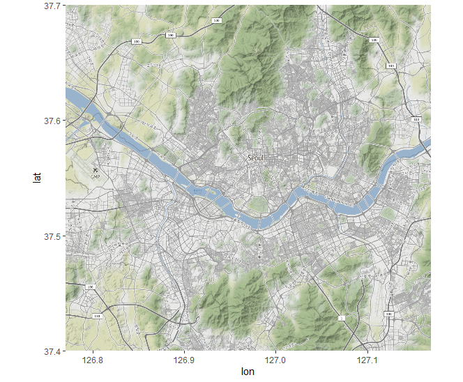 map <- get_stamenmap(seoul, zoom = 12, maptype = 'terrain')