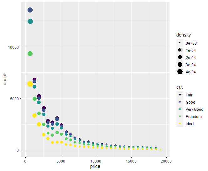 p + stat_bin(aes(color=cut, size = ..density..),geom = "point")