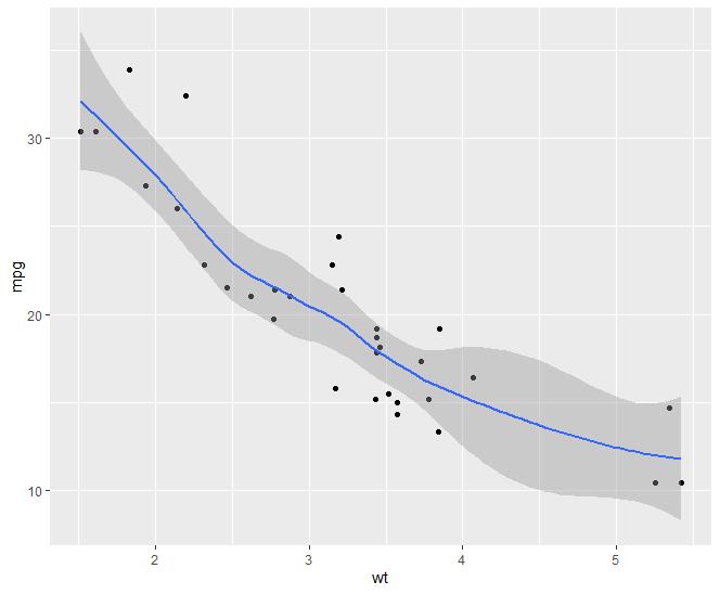 qplot(wt,mpg,data=mtcars,geom = c("point", "smooth"))