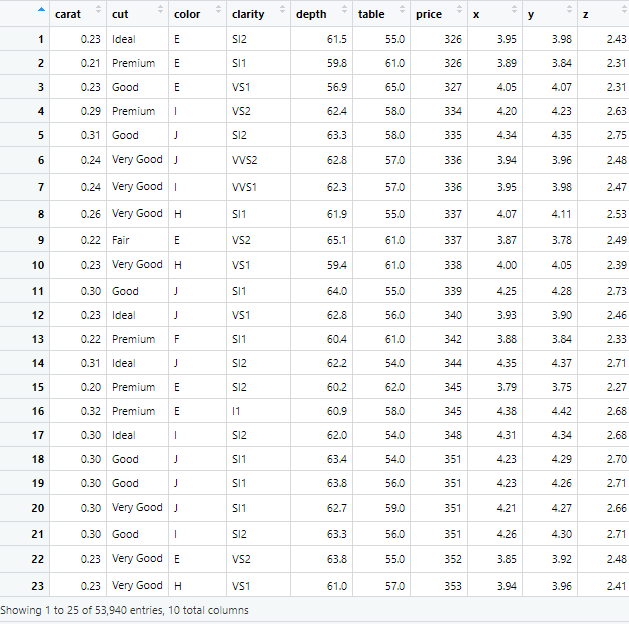 ggplot2 패키지에서 제공하는 데이터 셋으로, 약 5만4천개의 다이아몬드에 관한 속성을 기록한 데이터 셋으로 53,940개의 관측치와 10개의 변수로 구성되어 있다.