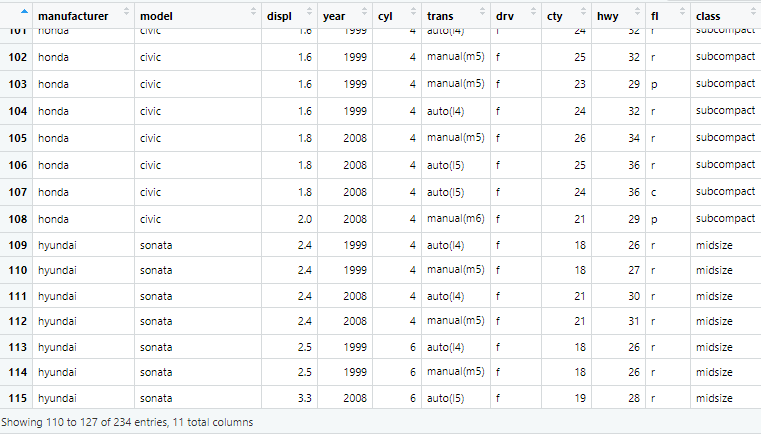 ggplot2 패키지에서 제공하는 데이터 셋으로, 자동차 모델에 관한 사양이 기록된 데이터 프레임이다. 전체 관측 32개와 11개의 변수로 구성되어 있다.