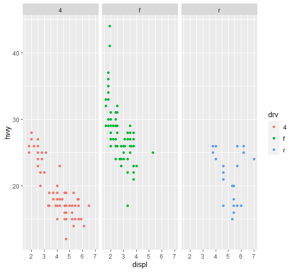 - displ 과 hwy 변수와 관계를 drv로 구분