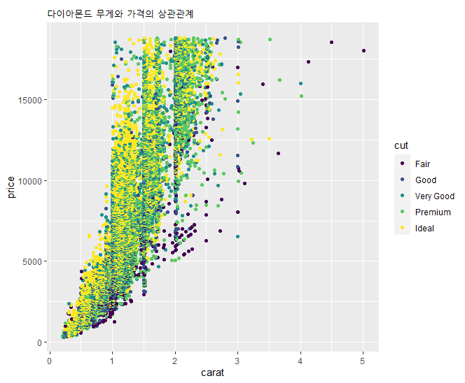 p <- p + geom_point() + ggtitle("다이아몬드 무게와 가격의 상관관계")