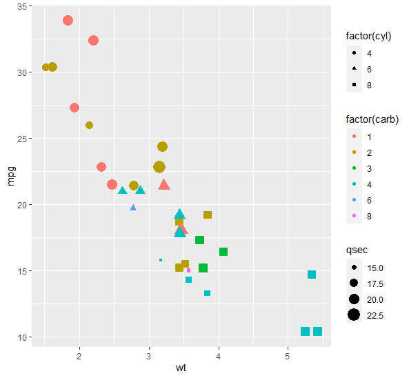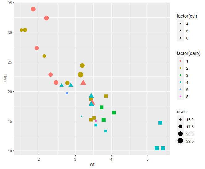 qplot(wt,mpg,data=mtcars, size=qsec, color=factor(carb), shape=factor(cyl),geom = "point")