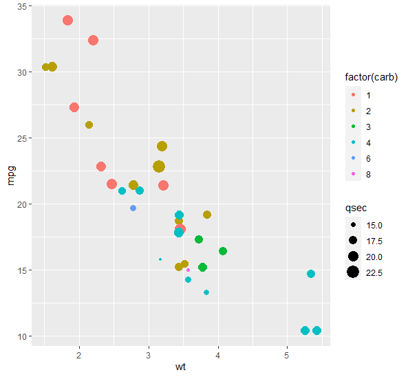 qplot(wt,mpg, data=mtcars, color=factor(carb), size=qsec) # 크기 적용