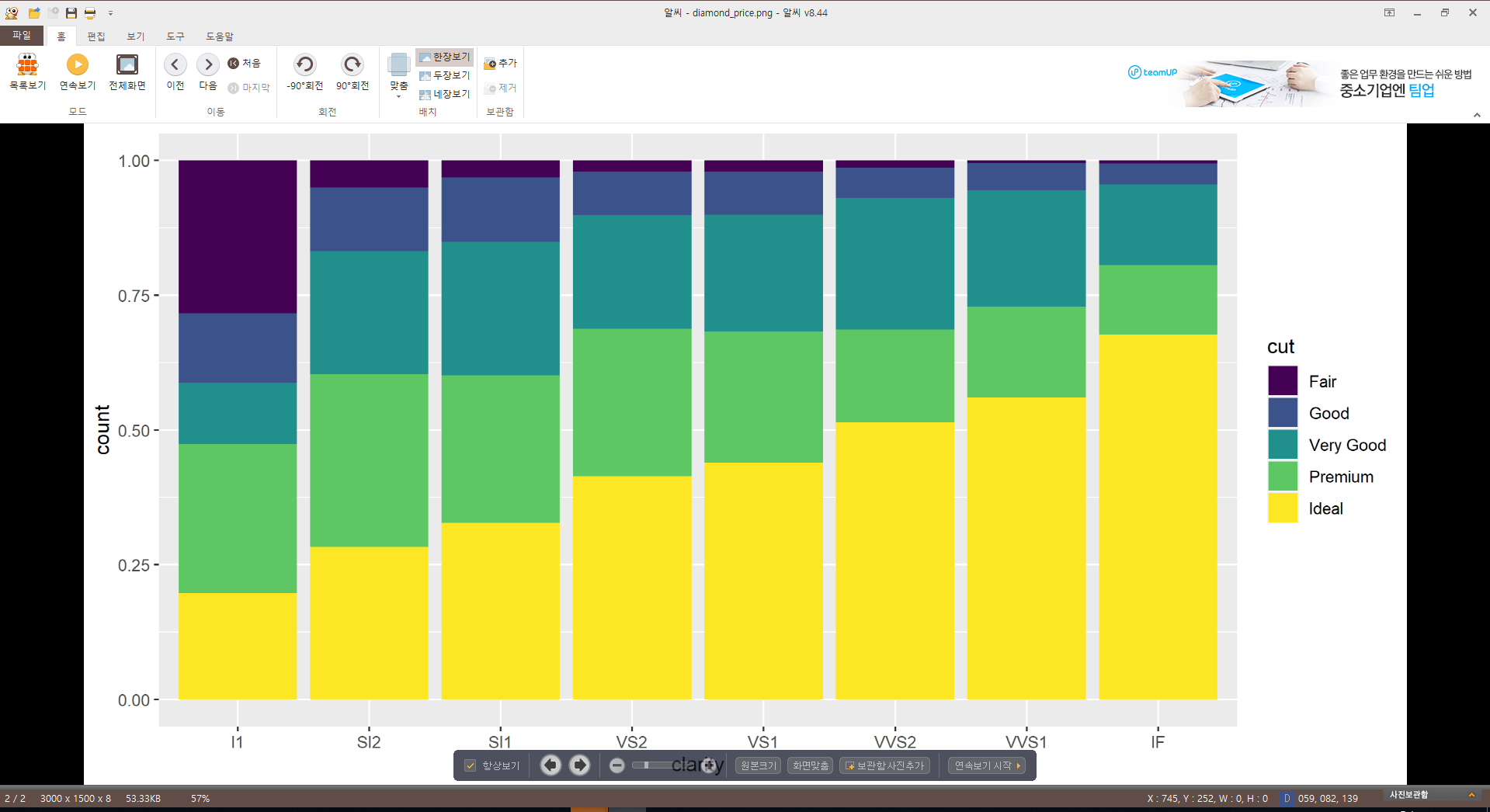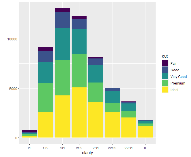 clarity 빈도수 막대 그래프 + fill=cut, geom = "bar" (색 채우기)