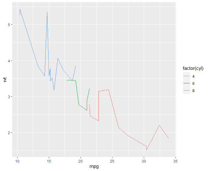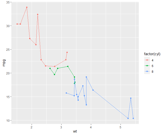 qplot(wt,mpg,data=mtcars,color=factor(cyl), geom = c("point","line"))