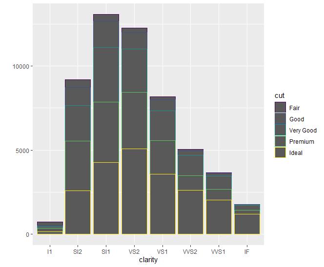 qplot(clarity, data=diamonds, color=cut, geom = "bar")
