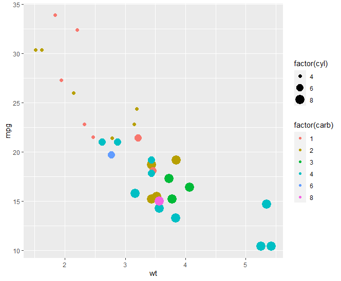 qplot(wt,mpg, data=mtcars, color=factor(carb), size=factor(cyl), geom = "point")
