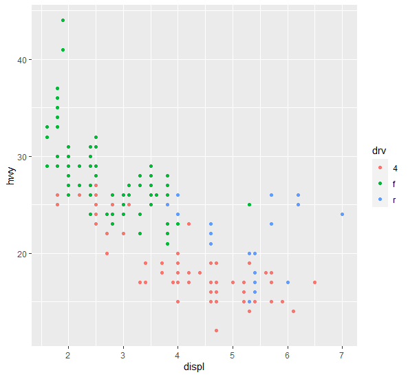 qplot(displ, hwy, data=mpg, color = drv)