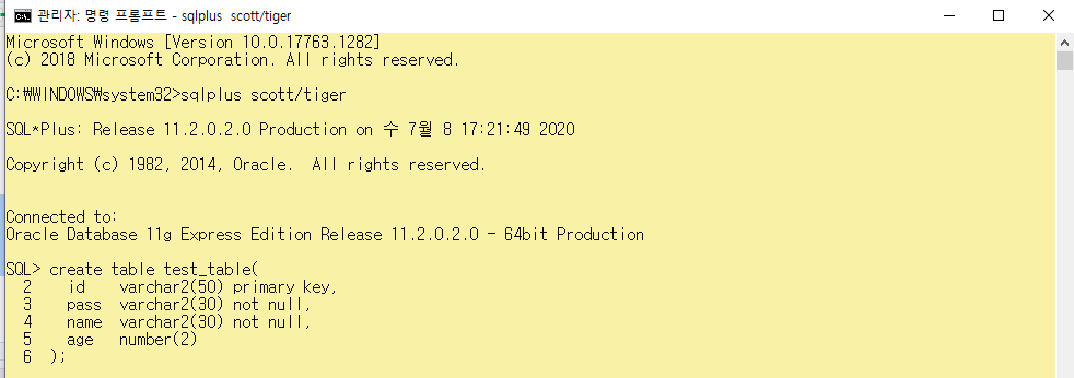 - sqlplus 명령문으로 접속 후 다음의 데이터 생성