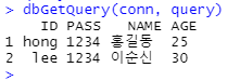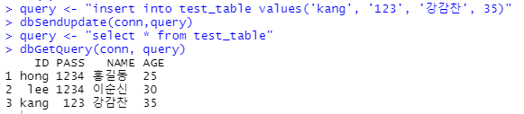 query <- "insert into test_table values('kang', '123', '강감찬', 35)"