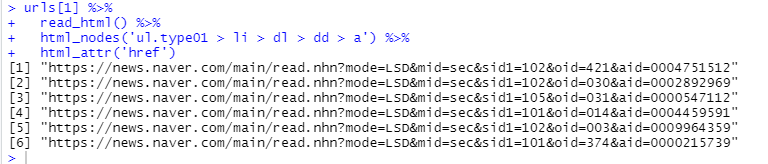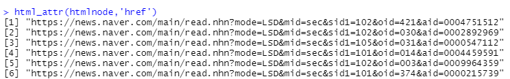 htmlnode <- html_nodes(html,'ul.type01 > li > dl > dd > a') # 첫페이지 네이버 뉴스 링크
