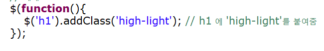 addclass 를 통해서 h1의 high-light를 붙여줌이르써 속성이 적용됩니다.