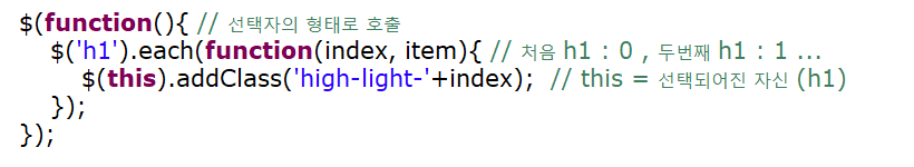 - 각 객체에 서로 다른 class 속성을 설정하고 싶을 때 each( ) 메서드 사용