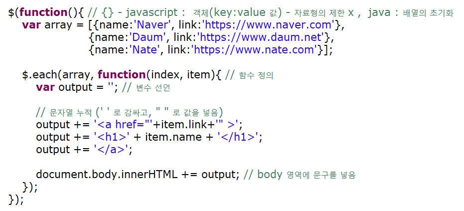 $.each(object, function(index, item){}); : 반복문과 같이 object 값을 읽어옵니다.