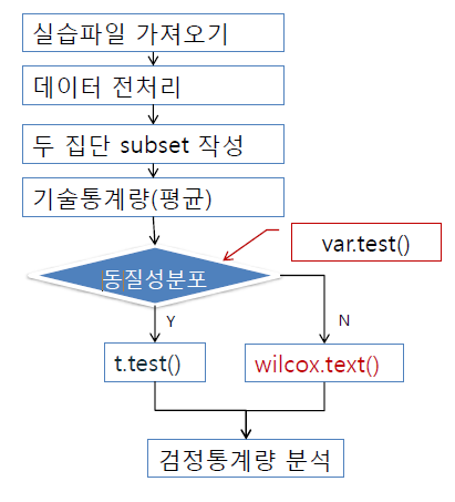 -> 정규분포를 따를 때 = t.test() or 정규분포를 따르지 않을 때 = wilcow.test()