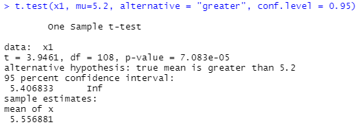 t.test(x1, mu=5.2, alternative = "greater", conf.level = 0.95)