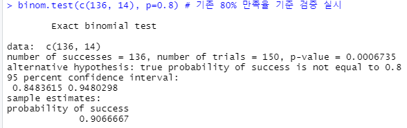 binom.test(c(136, 14), p=0.8) # 기존 80% 만족율 기준 검증 실시