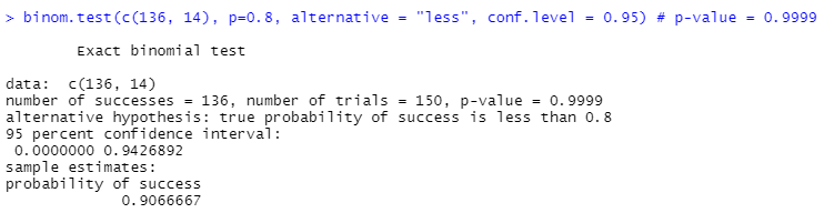binom.test(c(136, 14), p=0.8, alternative = "less", conf.level = 0.95) # p-value = 0.9999