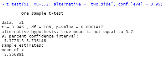 t.test(x1, mu=5.2, alternative = "two.side", conf.level = 0.95)
