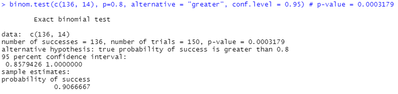 binom.test(c(136, 14), p=0.8, alternative = "greater", conf.level = 0.95) # p-value = 0.0003179