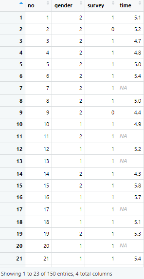 $ time : num 5.1 5.2 4.7 4.8 5 5.4 NA 5 4.4 4.9 ...