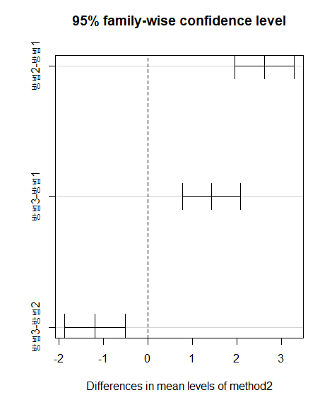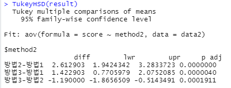 최종 결과 : 유의수준 0.05 에서 귀무가설이 기각되었다 . 따라서 교육방법에 따른 세 집단 간 실기시험의 평균에 차이가 있는 것으로 나타났다 . 또한 사후검정 방법인 Tukey 분석을 실시한 결과 '방법2 - 방법1’ 의 평균 점수의 차이가 가장 높은 것으로 나타났다.