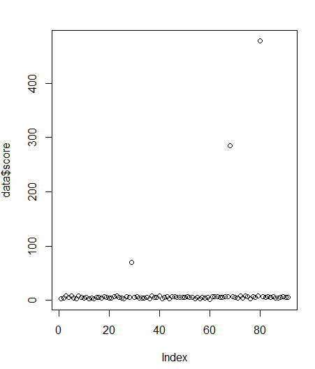 plot(data$score) # 차트로 outlier 확인 : 50이상과 음수값