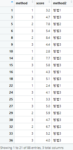 length(data2$score) 출력값 : [1] 88 (3개 필터링)