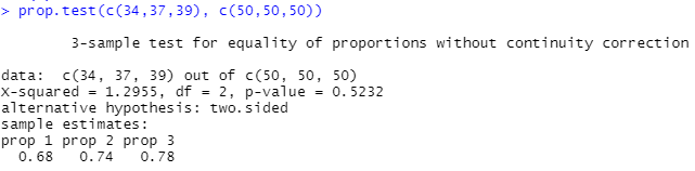 prop.test(c(34,37,39), c(50,50,50)) - 입력 값에 따라 변경