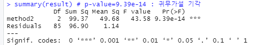p-value=9.39e-14 < 0.05 귀무가설 기각