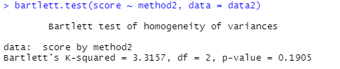 bartlett.test(종속변수(y축) ~ 독립변수(x축) , data)