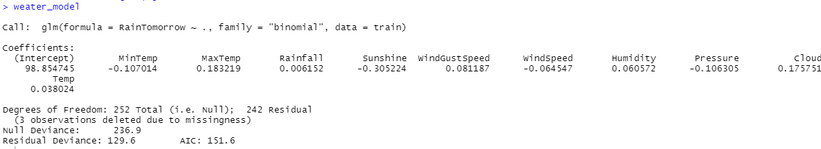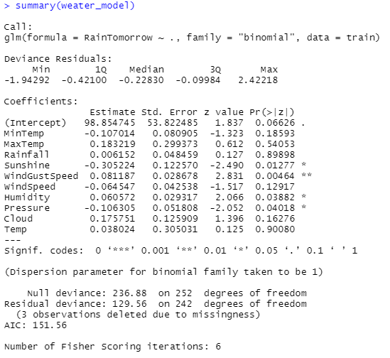 weater_model <- glm(RainTomorrow ~ ., data = train, family = 'binomial')