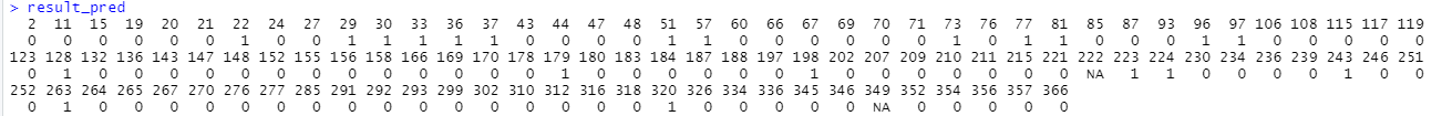 result_pred <- ifelse(pred >= 0.5, 1, 0) # 비가올 활률 50% 이상 : 1, 비가올 활률 50% 이하 : 0