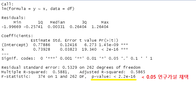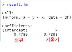 result.lm # 회귀계수 ( 절편과 기울기 )