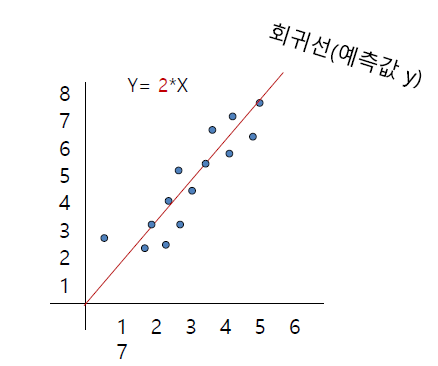 - 회귀 방정식(Y=a+βX → Y:종속변수, a:상수, β:회귀계수, X:독립변수)을 도출하여 회귀선 추정