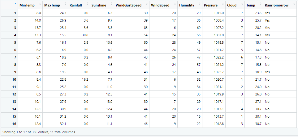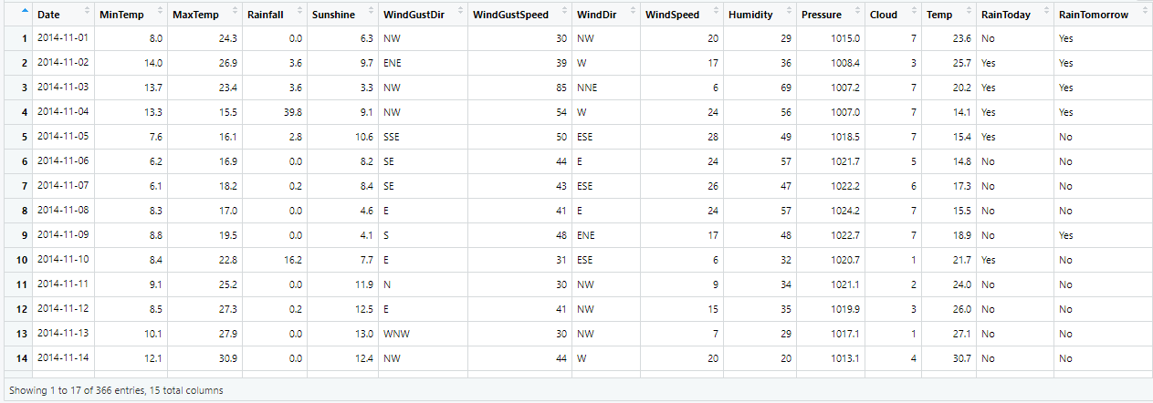 $ MaxTemp : num 24.3 26.9 23.4 15.5 16.1 16.9 18.2 17 19.5 22.8 ...